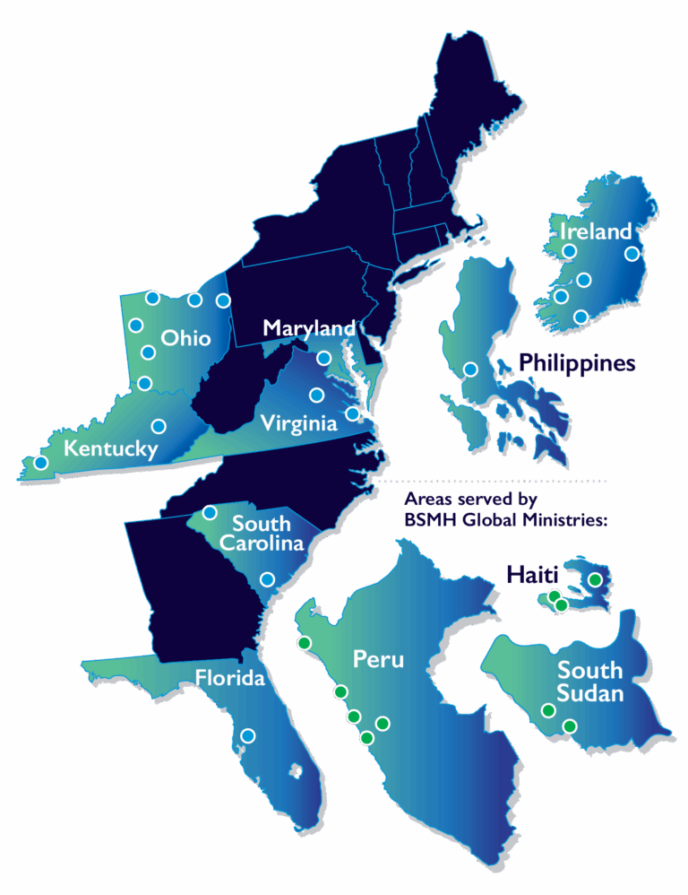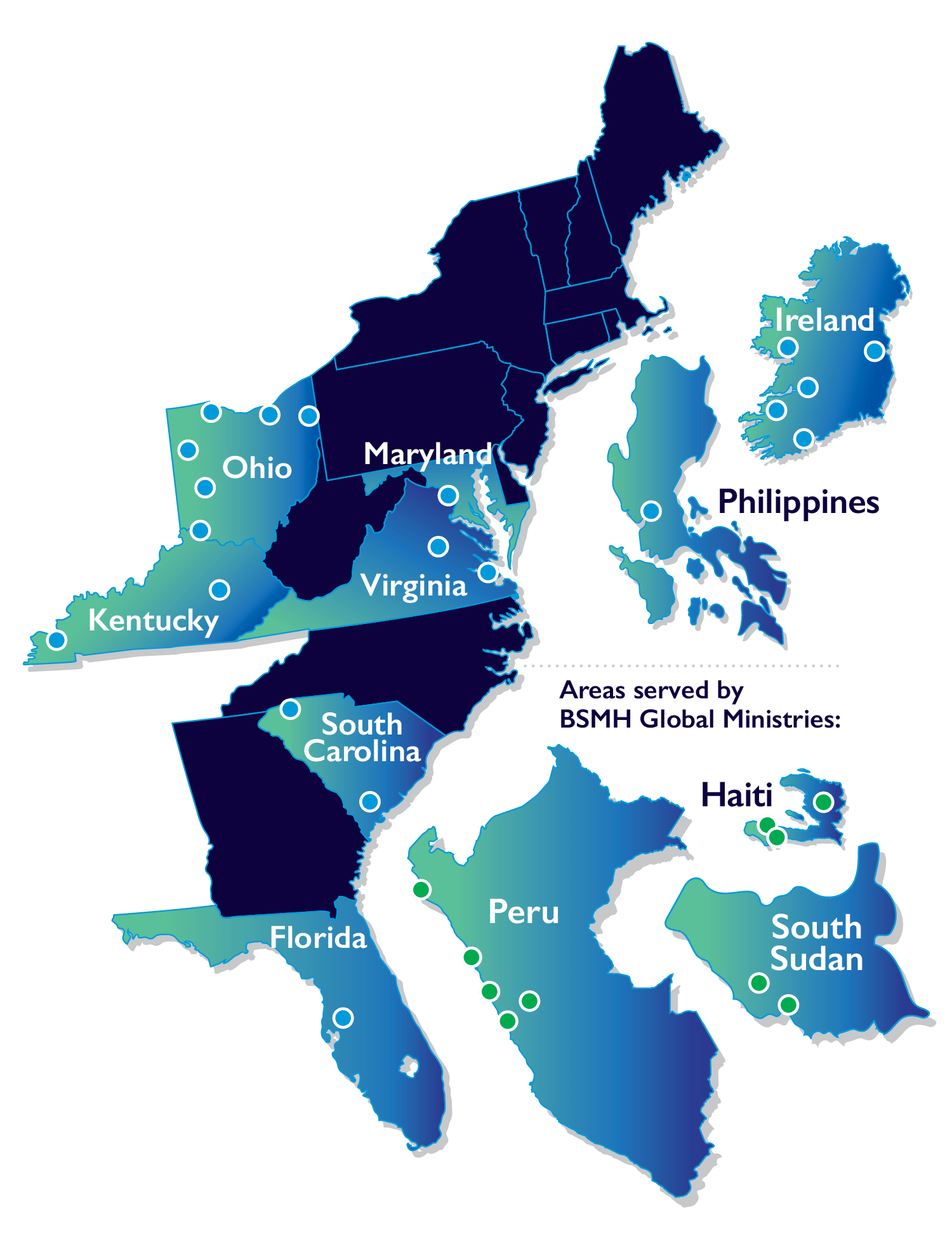 At Bon Secours Mercy Health, our health care locations span six states – Florida, Kentucky, Maryland, Ohio, South Carolina and Virginia – and five locations in Ireland. Our Global Ministries support Bon Secours Mercy Health’s Mission by actively addressing the needs of those who are poor and vulnerable, primarily in Peru, Haiti, and South Sudan.